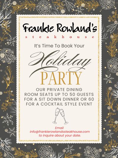 Our private dining room is waiting for you this holiday season! Full service bar, large private room for a sit down dinner or cocktail style event. Customize your own menu or choose one of our pre selected offerings. Variety of appetizers including our carving station to impress your guests and don't forget our hand crafted holiday cocktails! Our team approach makes guest service a level above any other restaurant in the Roanoke Valley. What are you waiting for? Email info@frankierowlandssteakhouse.com to inquire about your date today!